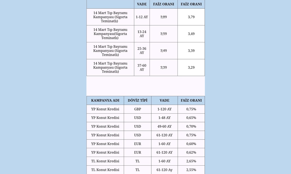 Dear Member, In honor of Medical Professionals' Day, Türkiye İş Bankası has organized a special loan campaign for all public and private sector healthcare professionals working in healthcare institutions and organizations. Medical Professionals' Day Campaign and Housing Loan Interest Rates are presented in the attached tables for your information. For detailed information, please contact the Individual Teams at all branches. The campaign is valid until March 31, 2026.