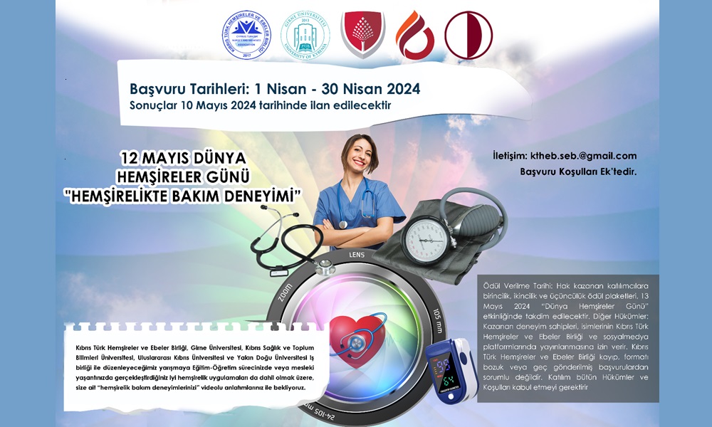 Girne Üniversitesi, Kıbrıs Sağlık ve Toplum Bilimleri Üniversitesi, Uluslararası Kıbrıs Üniversitesi ve Yakın Doğu Üniversitesi iş birliği ile düzenleyeceğimiz yarışmaya Eğitim-Öğretim sürecinizde veya mesleki yaşantınızda gerçekleştirdiğiniz iyi hemşirelik uygulamaları da dahil olmak üzere, size ait “hemşirelik bakım deneyimlerinizi” videolu anlatımlarınız ile bekliyoruz. Yarışmaya son katılım tarihi 30 Nisan 2024 salı günüdür.